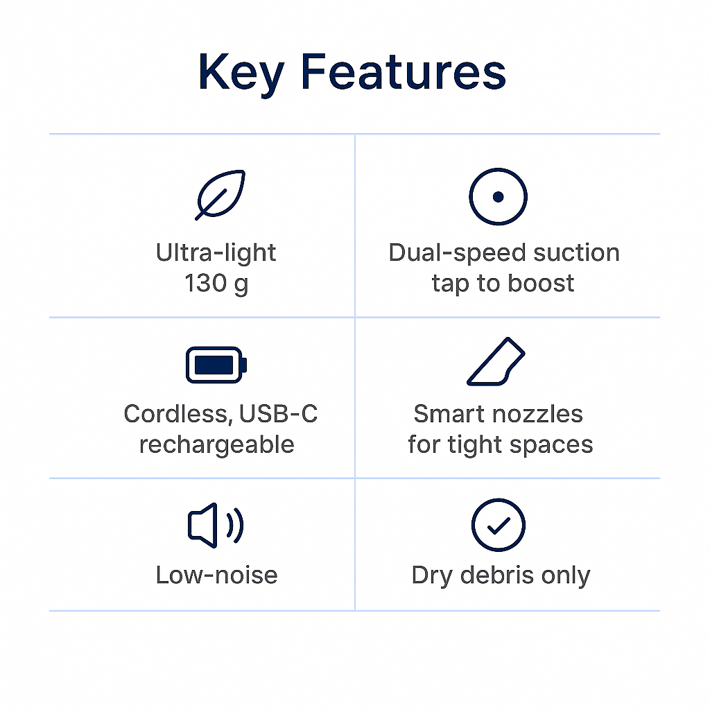 Powered by a USB-C rechargeable battery, it’s quiet, durable, and perfect for desks, keyboards, and car interiors.